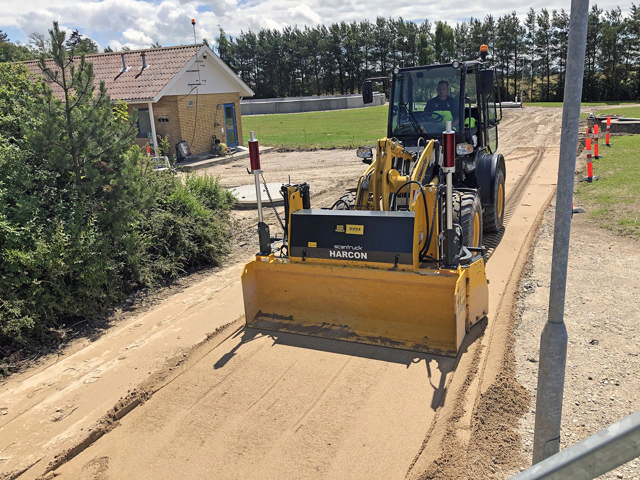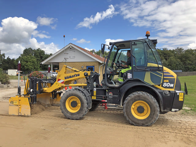 ”Den nye Komatsu WA80M-8 er egentlig købt som servicemaskine til at udføre alskens opgaver rundt om på byggepladserne. Men den kører så effektivt med Harcon-afretterbladet, at jeg godt kan se gode muligheder for, at de sammen kan give os mere belægningsarbejde”, siger Jim Kaae Jensen.