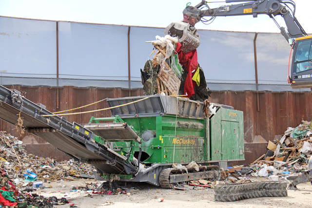 Hos Norrecco tygger McCloskey-neddeleren sig daglig igennem tonsvis af bygge- og anlægsaffald i form af gulvtæpper, paller, trækasser, rør, store og små dimser og alt andet, der ikke er bestemt for firmaets knusere til hårdere materialer. En materialehåndteringsmaskine fodrer den 35 tons grønne maskine, som begærligt tager imod og kværner alt med roterende knive. McCloskey ES-250 er en to-valset maskine, og knivene på de dobbelte aksler kører asynkront i begge retninger for at sikre optimal effektivitet.